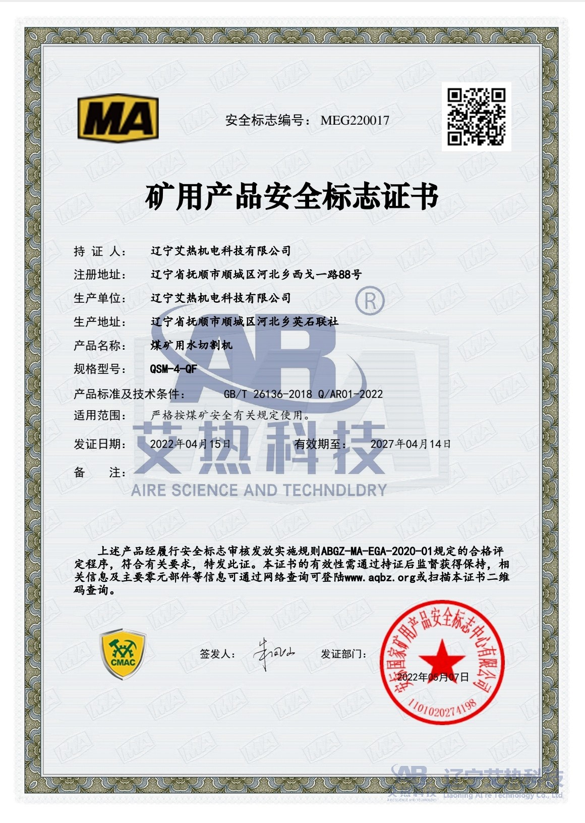 热烈祝贺艾热科技取得气动型煤矿用水切割机安全标志认证